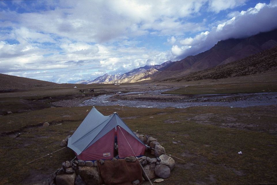 Wir standen enttäuscht am Haus und starrten mit Tamdings Frau in die Berge. Während sie nach ihrer Erklärung weiter nickend hinüberwies, suchten wir stirnrunzelnd die Stelle, an der sich das Markha Valley befinden musste. Über die inzwischen schneebedeckten Hänge und Felsenketten zogen Unwetter. Bei dem Anblick schien es mit einem Schlag unvorstellbar an diesem Fleck gewesen zu sein. Grauer Dunst, von mächtigen Winden geschoben, hin- und hergezerrt, gab kaum den Blick frei. Da in der Wolkensuppe hockt Tamding mit seiner neuen Kundschaft unter der Plane, reibt die Goldmedaille zwischen den Fingern, während der Wind lauter als der Kerosinkocher pfeift. Wie war es möglich, dass wir vor zwei Tagen in kurzen Hosen und T-Shirt ebendort zwischen vier- und fünftausend Metern herumspaziert sind? |